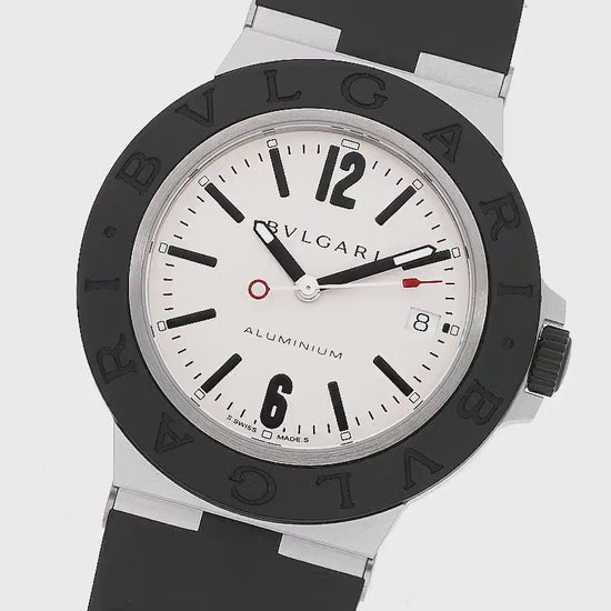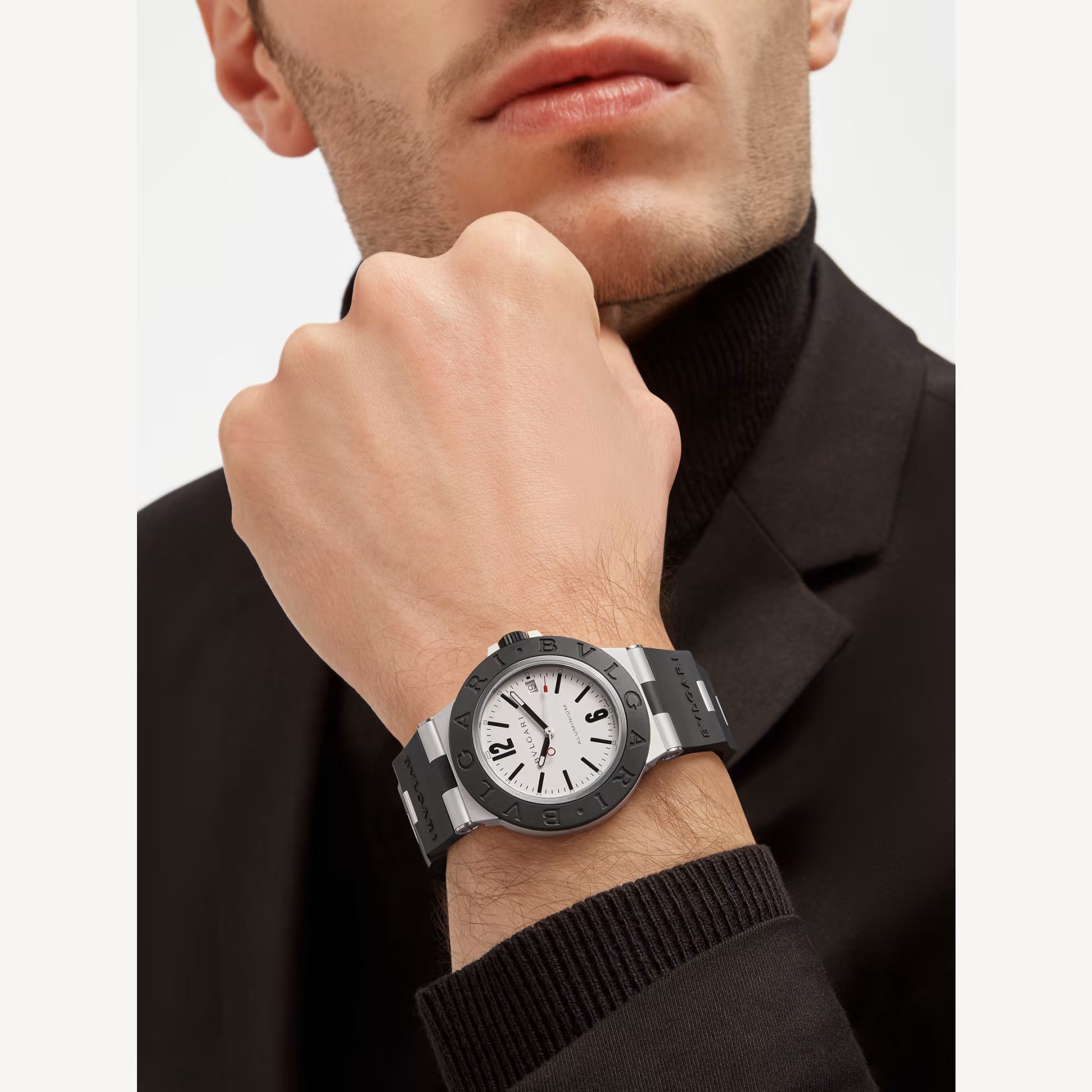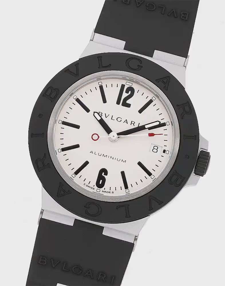 The Bvlgari Aluminium Ref. 103382 stands as a fearless icon that rewrote the rules of luxury watchmaking. First introduced in 1998, this trailblazing design challenged convention with its unconventional choice of materials — aluminium and rubber — and its unapologetically contemporary aesthetic. More than two decades later, it remains a symbol of effortless modernity, transcending gender, age, and style. The 40 mm aluminium case, paired with a black rubber bezel engraved with the signature double “BVLGARI BVLGARI,” captures a minimalist yet bold attitude that’s instantly recognizable. The grey dial, accented with luminous hands and a discreet date display, maintains the watch’s sporty elegance. At its core beats the BVL 191 automatic movement, offering 42 hours of power reserve and impeccable Swiss precision. Finished with a black rubber strap and titanium pin buckle, this watch perfectly blends casual ease with high-end craftsmanship — a true everyday luxury for those who dare to be different.