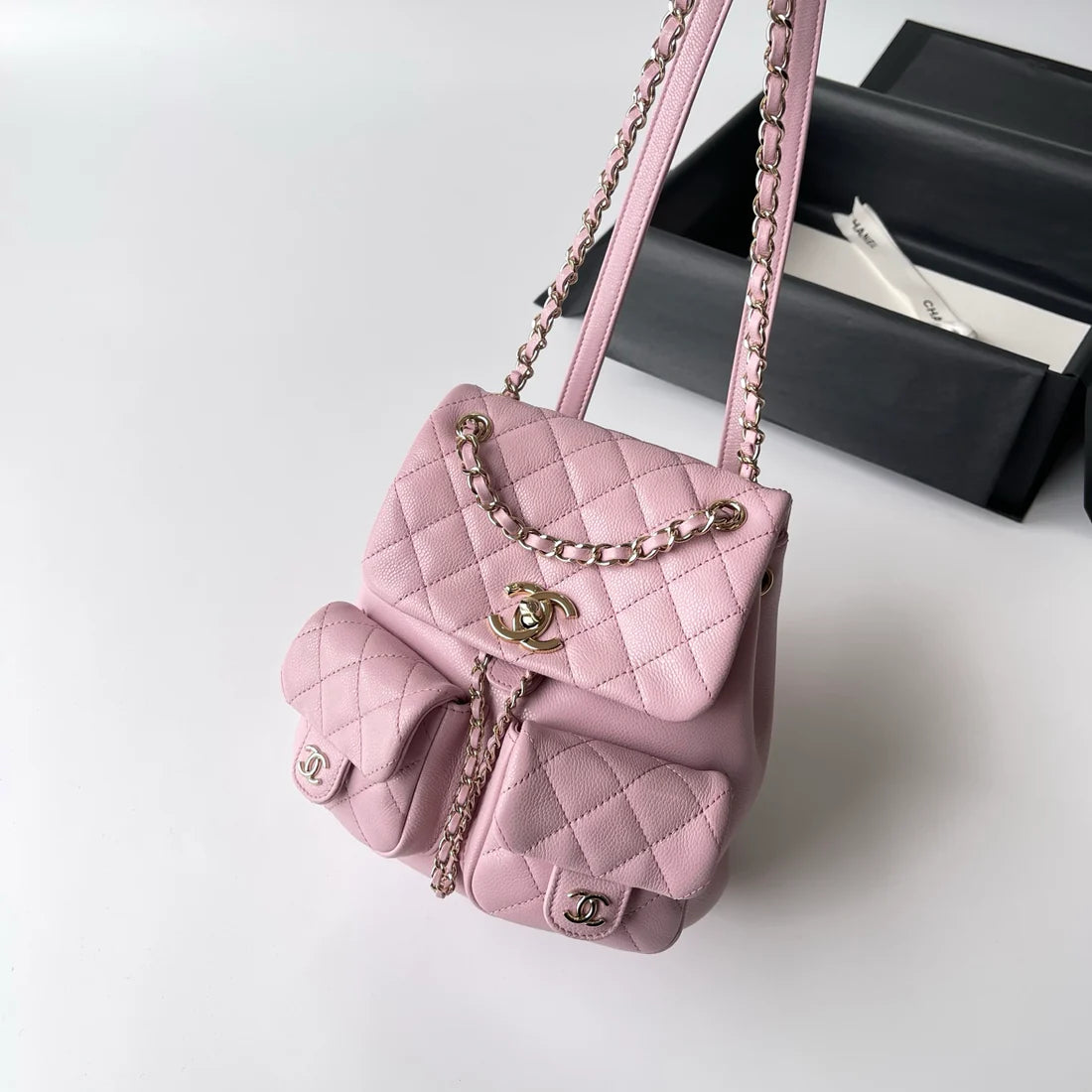 Crafted with attention to detail and luxury materials, the backpack features a secure zip closure, adjustable straps for comfortable wear, and a structured silhouette that maintains its shape while carrying your essentials. Its iconic Chanel aesthetic ensures a timeless addition to any collection.