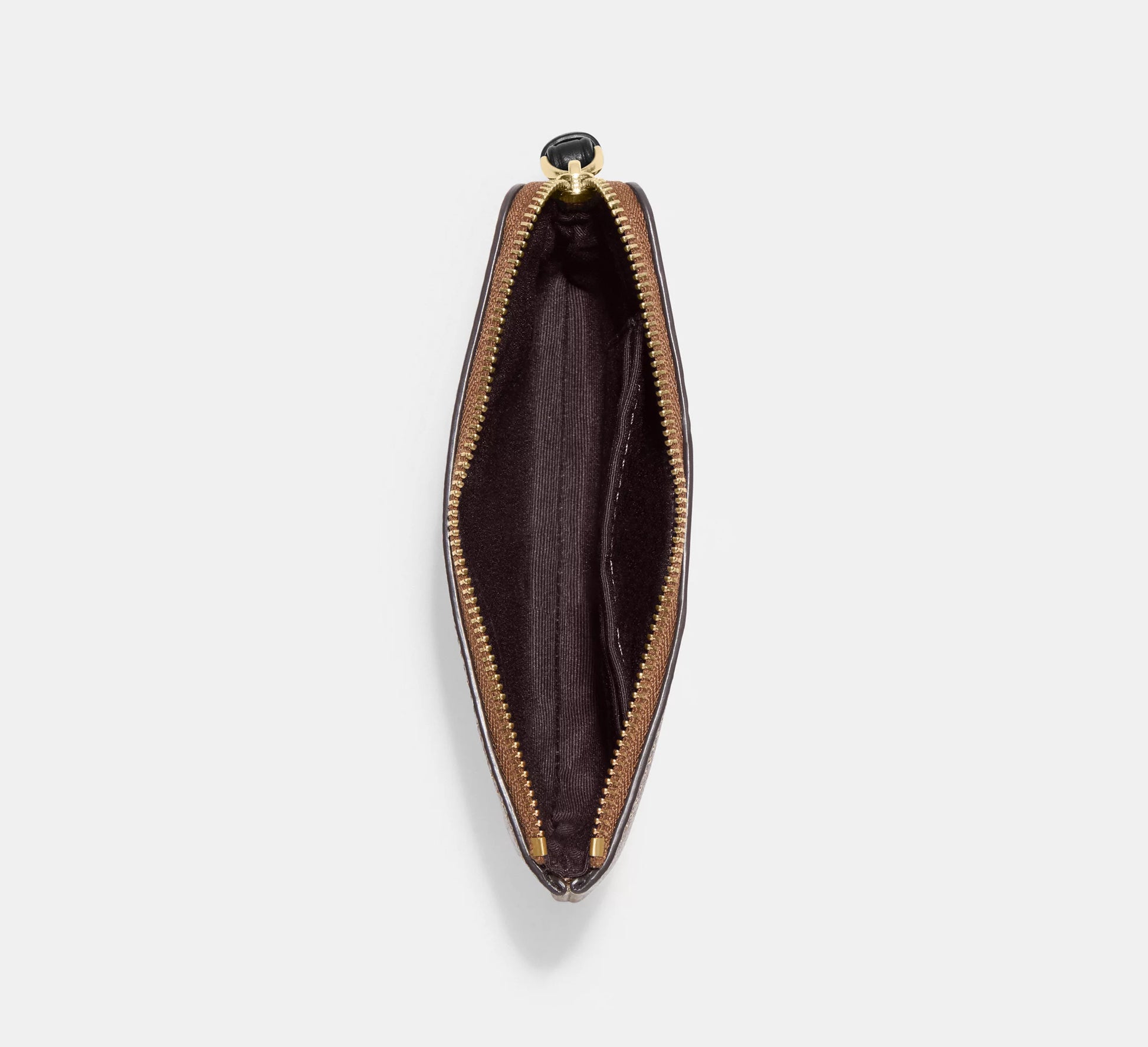 Style Number CJ792, our bestselling Corner Zip Wristlet, measures 6.25" in length, 4.0" in height, and 0.5" in width. Crafted from signature coated canvas and smooth leather with a fabric lining, it features a zip-top closure, an attached wrist strap, and two credit card slots. Perfectly sized for your phone, keys, and other small essentials, this versatile wristlet works great on its own or inside a larger bag.