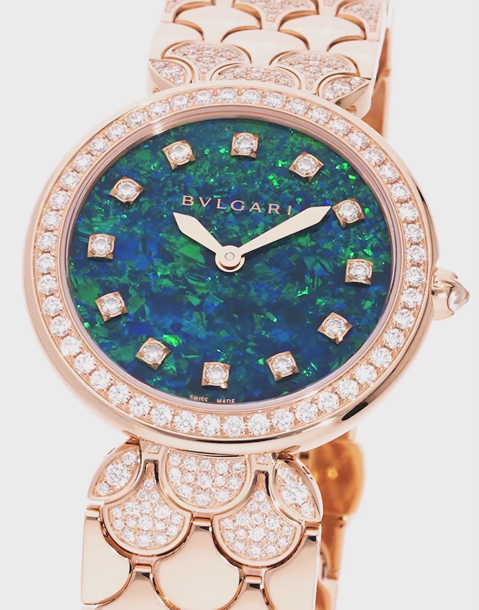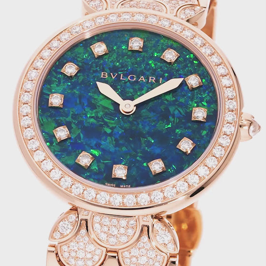 The Bvlgari Divas’ Dream Ref. 103646 embodies the elegance of Roman artistry through a dazzling blend of gemstones and craftsmanship. Crafted in 18 kt rose gold, this captivating timepiece features a luminous blue opal dial adorned with twelve diamond indexes, radiating the vibrant energy of the Eternal City. The bezel and bracelet, adorned with over 400 brilliant-cut diamonds, showcase the collection’s iconic fan-shaped motif inspired by the mosaics of the Caracalla Baths. Both refined and radiant, it’s a celebration of feminine grace and timeless glamour.