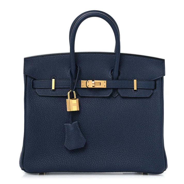 Elevate your collection with the Hermès Birkin 25 in Bleu Abysse, crafted from luxurious Togo calfskin leather for durability and a refined texture. This classic Birkin features rolled leather top handles, a front flap with strap closure, and polished gold-plated hardware, including the iconic turn-lock, blending timeless elegance with functional design.