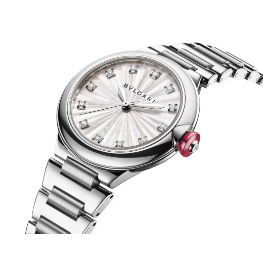 The Bvlgari Lvcea Ref. 103727 is a 33mm Swiss-made women’s automatic watch that radiates modern elegance and refined femininity. Crafted in polished and satin-brushed stainless steel, it beautifully merges Bvlgari’s jewelry craftsmanship with mechanical precision. The white mother-of-pearl intarsia dial—meticulously assembled from individually faceted elements in a marquetry-inspired design—captures and reflects light like the rays of the sun. Twelve round brilliant-cut diamond indexes illuminate the dial, while the cabochon-cut synthetic pink sapphire crown set with a diamond adds a touch of delicate luxury. Powered by an automatic movement with a 42-hour power reserve, the Lvcea delivers both timeless beauty and reliable performance.