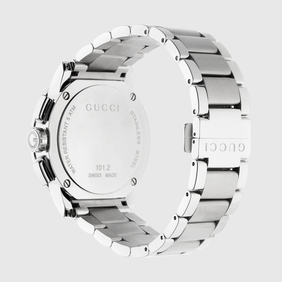 The Gucci G-Chrono (Model YA101204) features the House’s iconic G-shaped bezel, delivering a bold and contemporary sporty look. Crafted with a stainless steel case and bracelet, it showcases a black guilloché dial for refined contrast and modern elegance. Powered by a precise Swiss-made quartz movement, this timepiece offers dependable performance. With water resistance up to 50 meters and an adjustable bracelet for a comfortable fit, it is designed for everyday sophistication and durability.