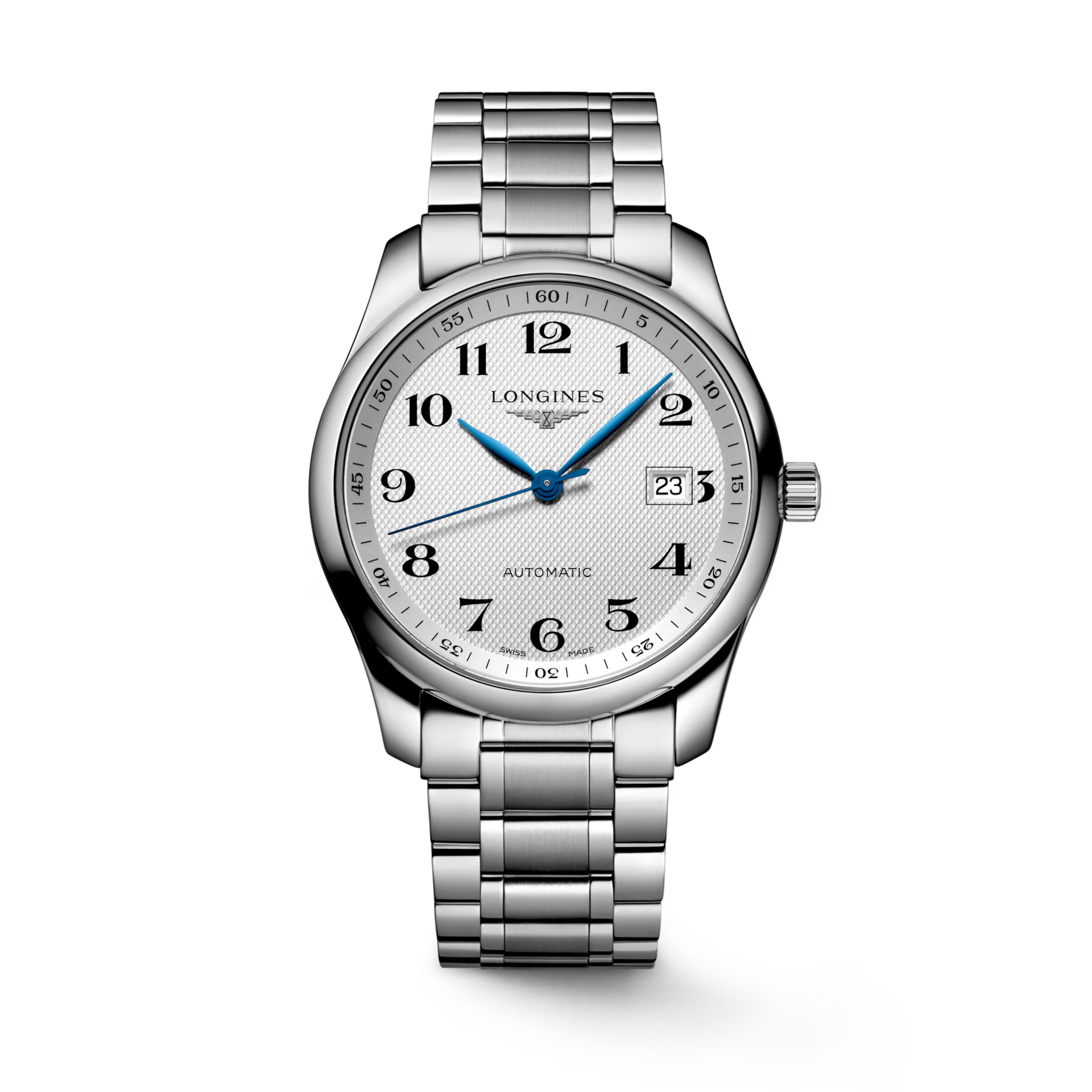 The Longines Master Collection Automatic (Model L2.793.4.78.6) pairs timeless elegance with Swiss precision. Its 40 mm stainless steel case frames a silver "barleycorn" dial with blued steel hands and painted Arabic numerals for refined readability. Powered by the L888 automatic movement, it offers a 72-hour power reserve. Water-resistant to 3 bar with a scratch-resistant sapphire crystal, it is ideal for everyday sophistication. The stainless steel bracelet with triple safety folding clasp and push-piece mechanism completes this luxurious timepiece.
