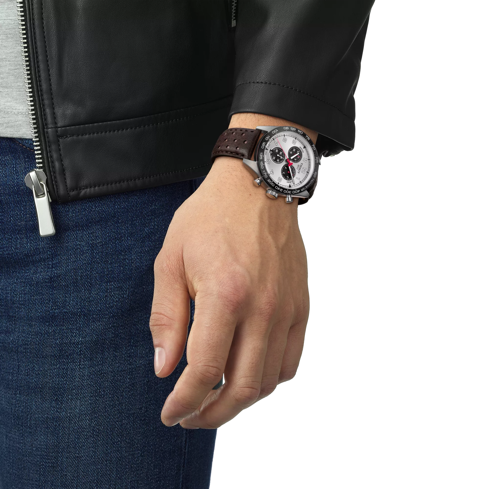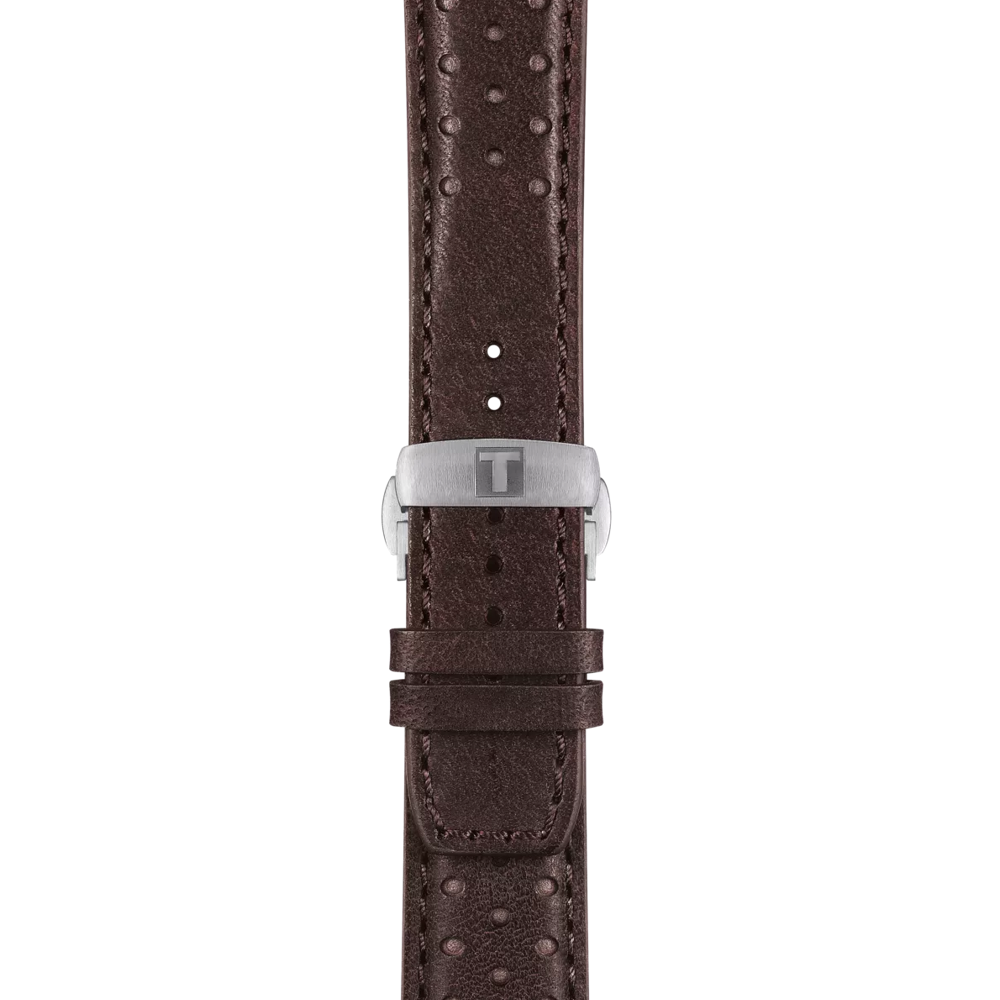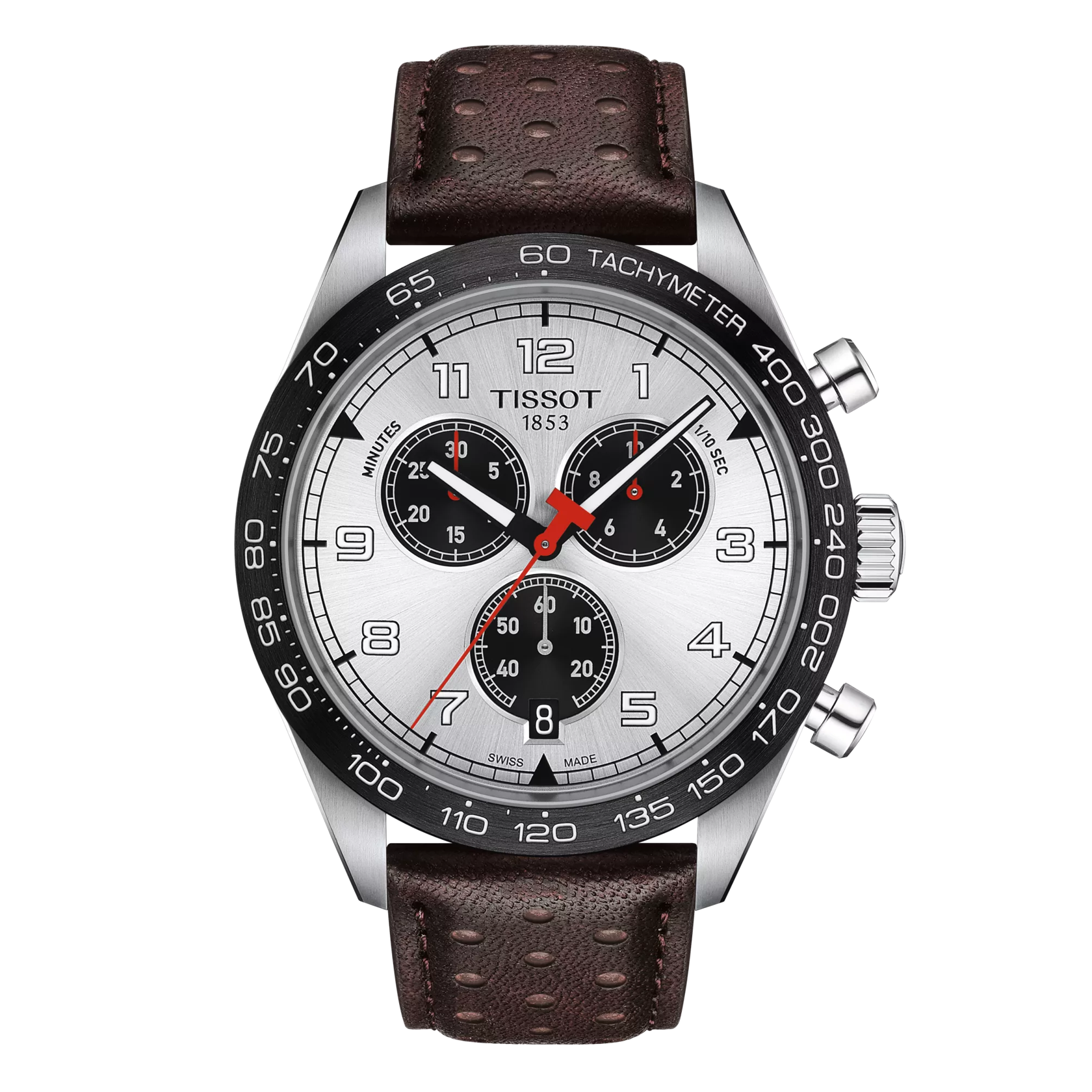 The Tissot PRS 516 is a tribute to classic sports cars, combining Swiss precision with racing-inspired design. Featuring a 45 mm stainless steel case with a black PVD coating and a silver dial with Super-LumiNova hands, this watch is designed for both style and performance. Its Swiss quartz movement with chronograph functions ensures precise timing, while the scratch-resistant sapphire crystal protects the dial. The adjustable embossed brown leather strap is interchangeable with a quick-release system, offering versatility for any occasion.