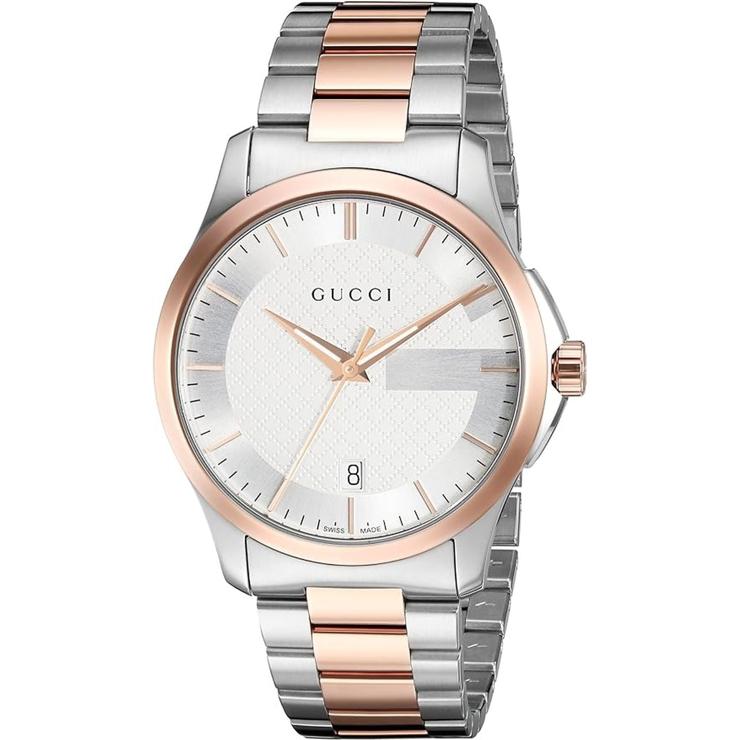 The Gucci G-Timeless YA126473 is a stylish 38mm men’s dress watch featuring a brushed and polished steel case with a rose gold-tone bezel. Its silver dial with luminescent hands and index markers offers easy readability, paired with a matching rose gold-tone steel bracelet. Perfect for formal occasions and everyday elegance.