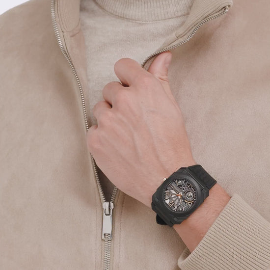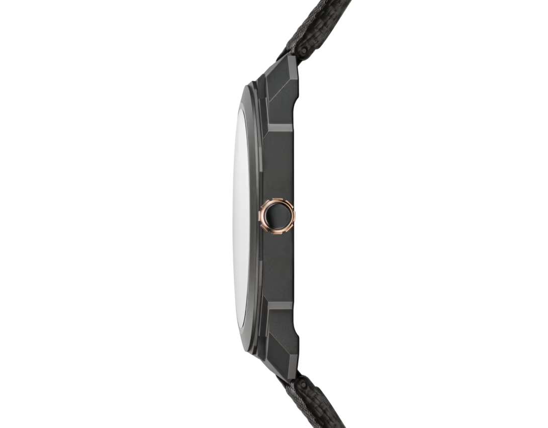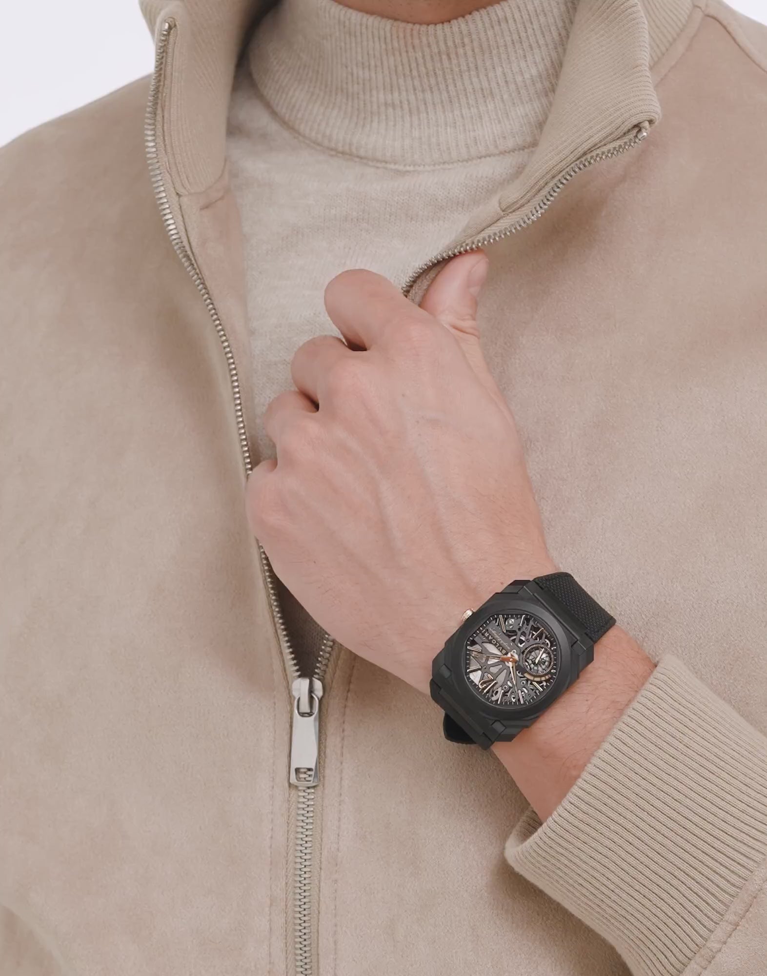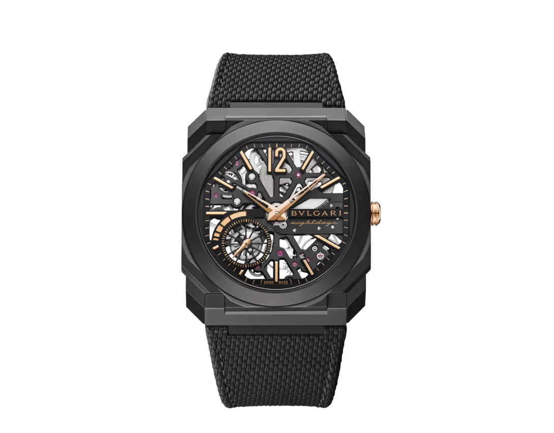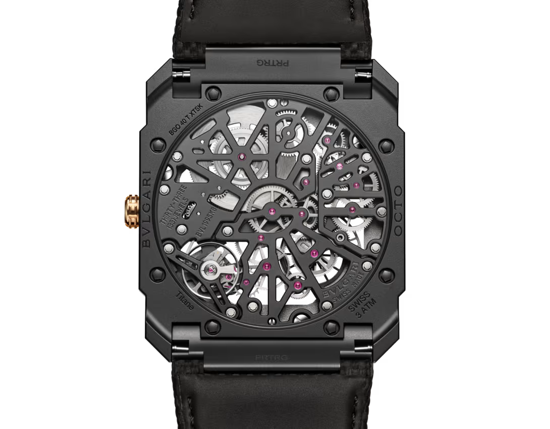 The Bvlgari Octo Finissimo Skeleton 8 Days Ref. 104121 is a mesmerizing display of mechanical artistry and modern design, merging Italian elegance with Swiss precision in a perfectly balanced architectural form. Encased in black DLC-coated titanium, this ultra-slim marvel (just 5.95 mm thick) houses the hand-wound BVL 199 SK calibre, an openworked movement that reveals the heart of Bvlgari’s horological mastery. The skeletonized bridges finished in black PVD expose a mechanical landscape of depth and symmetry, enhanced by rose gold-plated hands and indexes that glow against the dark architecture. With an astounding 8-day (192-hour) power reserve, meticulously displayed on the dial, this timepiece stands as a statement of innovation, endurance, and contemporary sophistication. The black rubber strap completes its sleek, modern profile—making it the ultimate expression of technical prowess and avant-garde style.