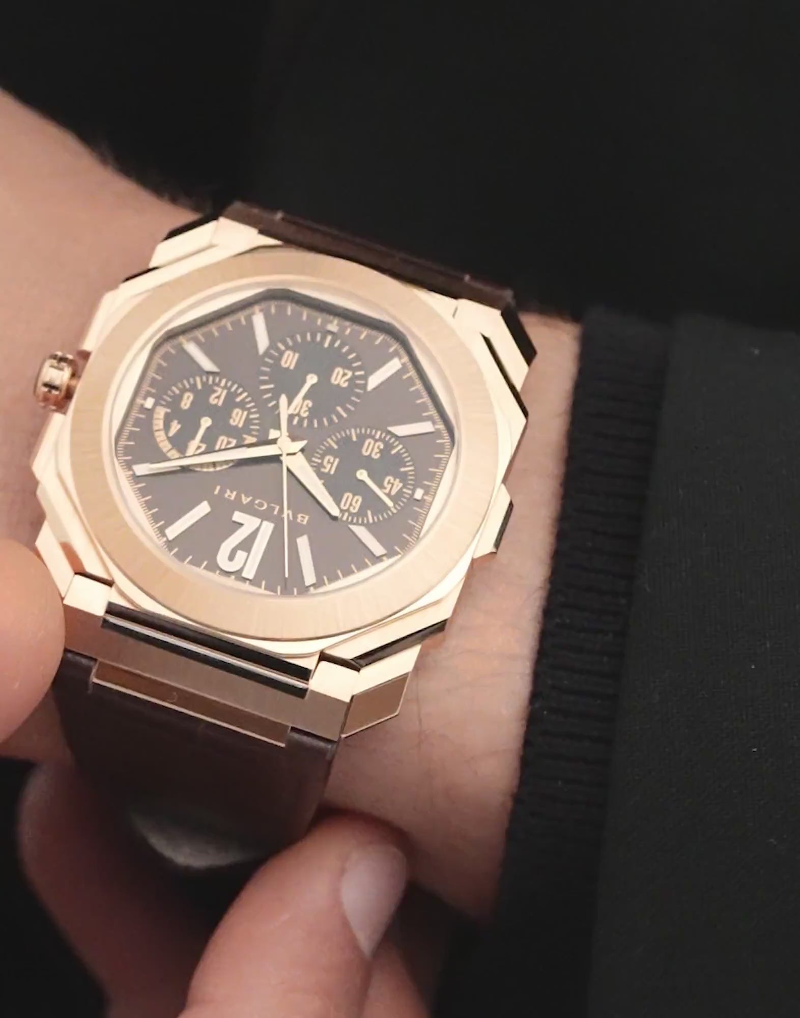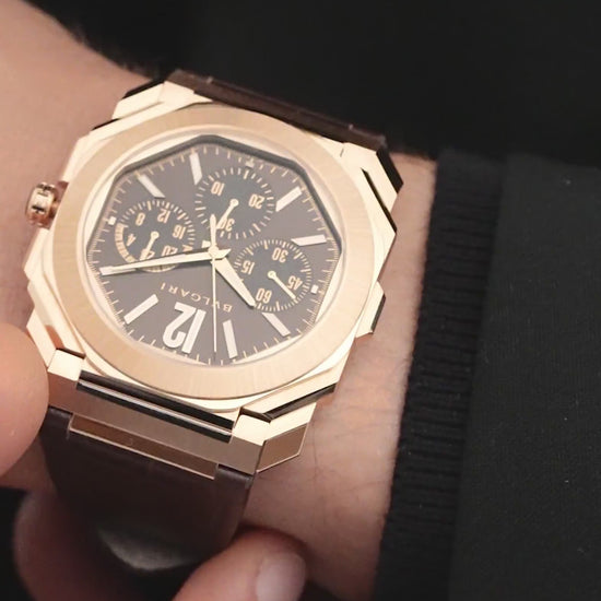 The Bvlgari Octo Finissimo Chronograph GMT Ref. 103468 is a masterpiece of technical brilliance and refined elegance, representing the pinnacle of contemporary haute horlogerie. As the world’s thinnest self-winding chronograph with a GMT function, it flawlessly merges Italian artistry with Swiss precision engineering. The 43 mm satin-polished 18 kt rose gold case, only 8.75 mm thick, embodies architectural sophistication, while the brown lacquered sunray dial and matching alligator strap exude warmth and luxury. At its heart beats the BVL 318 calibre, an ultra-thin automatic movement just 3.30 mm thick, featuring a peripheral rotor for seamless winding, a chronograph, and a dual time zone display. With its radiant gold tones, intricate mechanics, and a 55-hour power reserve, this timepiece stands as both a travel companion and a statement of impeccable taste—redefining the modern luxury sports chronograph with effortless Italian flair.