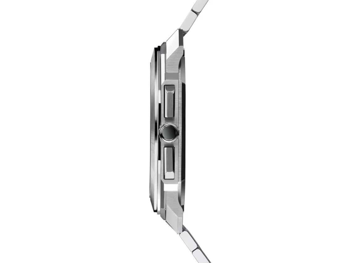 The Bvlgari Octo Finissimo Chronograph GMT Ref. 103467 is a triumph of technical mastery and architectural elegance, solidifying its status as the world’s slimmest self-winding chronograph with a GMT function. This groundbreaking timepiece embodies Bvlgari’s signature blend of Italian creativity and Swiss precision, merging practicality with refined aesthetics. Its 43 mm satin-polished stainless steel case, just 8.75 mm thick, houses the ultra-slim BVL 318 calibre—a mechanical marvel only 3.30 mm thin, equipped with a peripheral rotor for efficient automatic winding. The blue satin-polished dial, adorned with silver chronograph counters, creates a striking contrast that enhances both legibility and allure. With dual time zone capability, an impressive 55-hour power reserve, and robust 100-metre water resistance, this watch seamlessly balances form, function, and finesse—designed for those who move across continents without missing a beat.