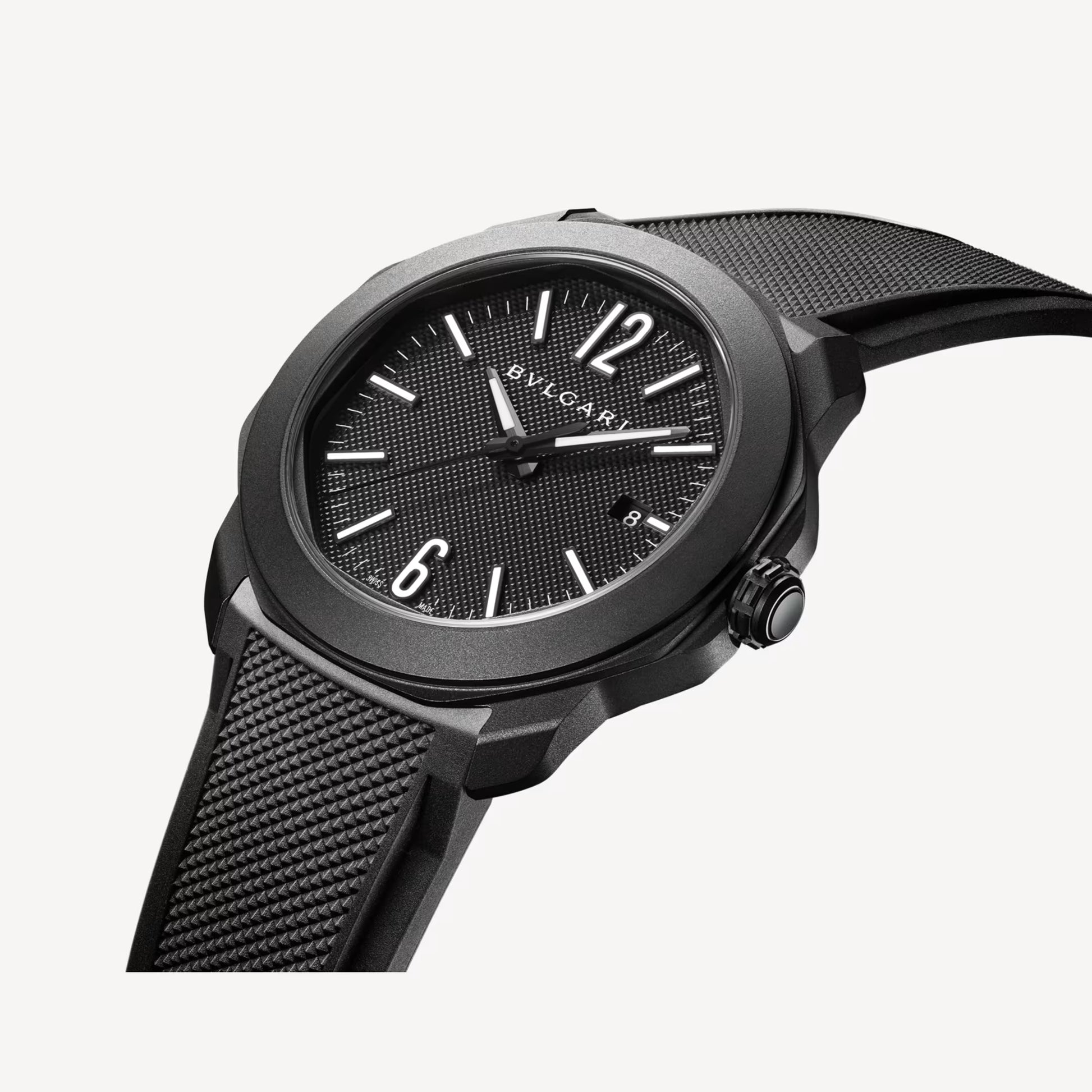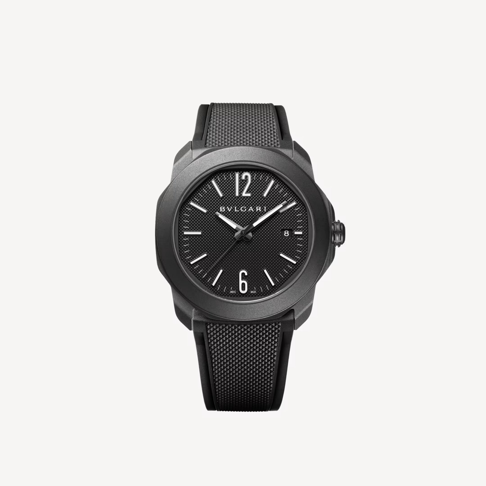 The Bvlgari Octo Roma Automatic Ref. 103927 is the definition of sophisticated minimalism with a dark twist — a timepiece that balances the refinement of Italian design with the precision of Swiss mechanics. Its round-but-not-round octagonal case, treated in black DLC (Diamond-Like Carbon), The 41 mm stainless steel case with DLC treatment gives it a sleek, stealthy presence, while the black Clous de Paris guilloché dial adds texture and depth to its monochromatic theme. Super-LumiNova®-filled metallic hands and indexes ensure legibility in any light, complemented by a date window at 3 o’clock for functional symmetry. Inside, the BVL 191 automatic calibre delivers a 42-hour power reserve, keeping time with quiet authority. The interchangeable black rubber strap provides a contemporary, sporty feel.