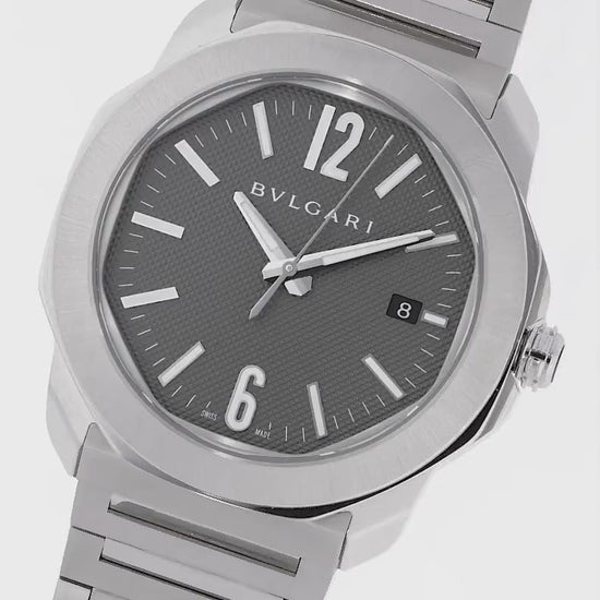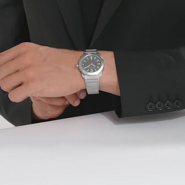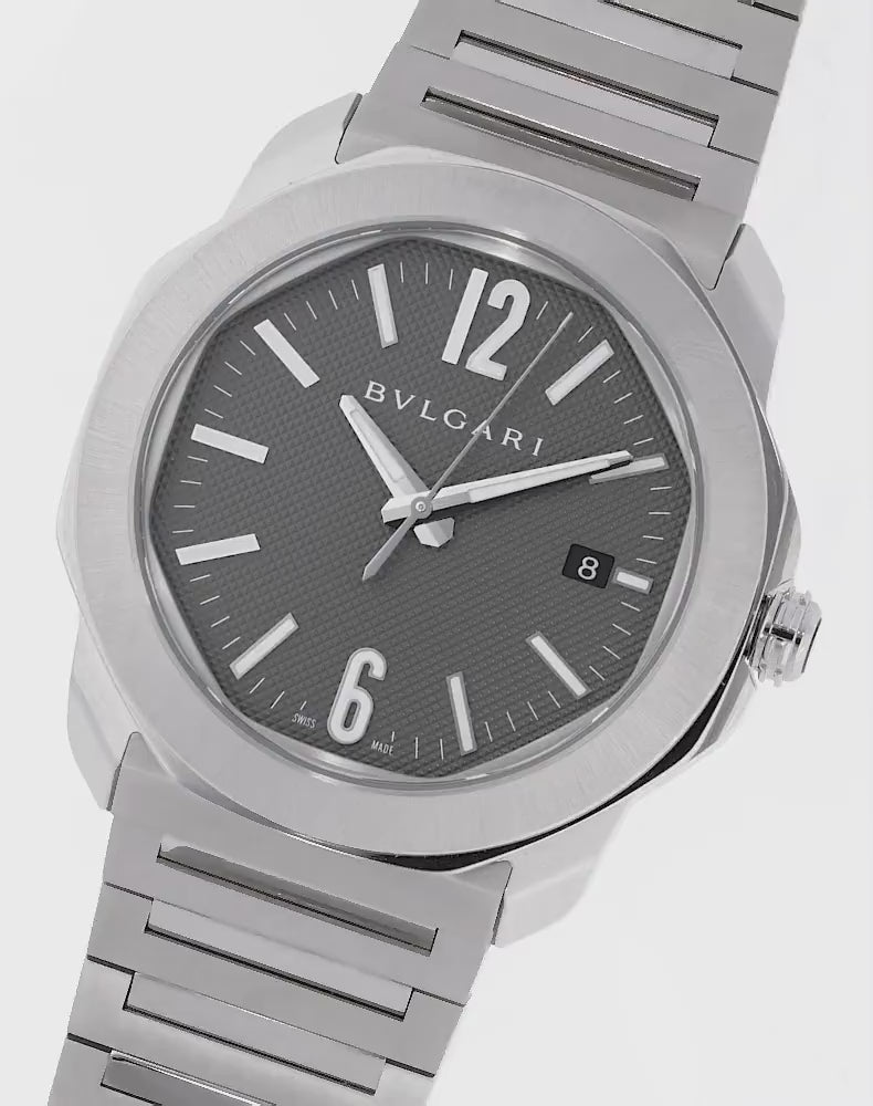 The Bvlgari Octo Roma Automatic Ref. 103740 is a masterclass in modern elegance — a geometric beauty that balances Roman architectural inspiration with Swiss precision and Italian flair. Its distinct octagonal-round case bridges bold structure with fluid sophistication, making it instantly recognizable without needing to shout for attention. At the heart of this refined exterior beats the in-house BVL 191 automatic calibre, ensuring that its beauty is matched by substance.The 41 mm satin-brushed and polished stainless steel case exudes subtle power, while the anthracite dial with its intricate Clous de Paris guilloché texture adds depth and character. Super-LumiNova® hands and hour markers ensure legibility even in low light, perfectly contrasting the dark dial’s refined texture. A date window at 3 o’clock brings functionality without compromising aesthetics. Completing the look is an interchangeable stainless steel bracelet that merges sharp lines with smooth polish, offering versatility between formal and casual wear. Water-resistant up to 100 metres, it’s as practical as it is artful — a contemporary classic designed for those who move effortlessly between worlds.