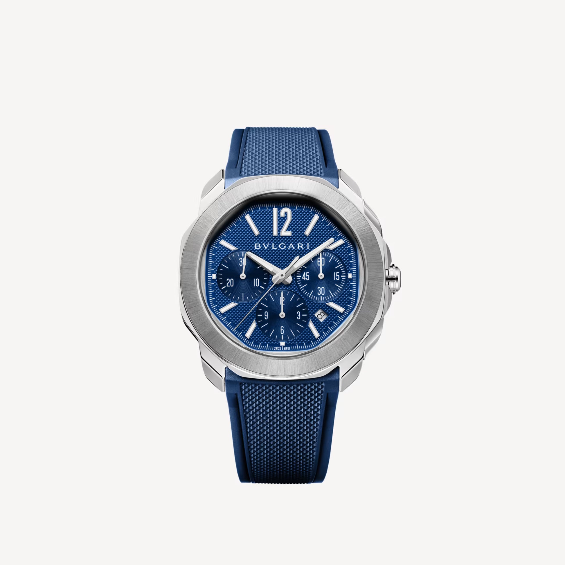 The Bvlgari Octo Roma Chronograph Ref. 103829 represents a flawless union of Roman architectural inspiration, Italian sophistication, and Swiss horological mastery. Its distinctive octagonal stainless steel case embodies balance and boldness, while the blue Clous de Paris dial adds depth and refined texture. Powered by the in-house BVL 399 automatic calibre, the timepiece delivers precise chronograph performance, featuring three sub-dials for intuitive reading and a discreet date display. With its Super-LumiNova®-filled hands and indexes, the watch ensures legibility in any light, merging practicality with elegance. Complemented by an interchangeable satin-brushed and polished stainless steel bracelet, this chronograph captures Bvlgari’s vision of timekeeping — a seamless fusion of form, function, and timeless craftsmanship.