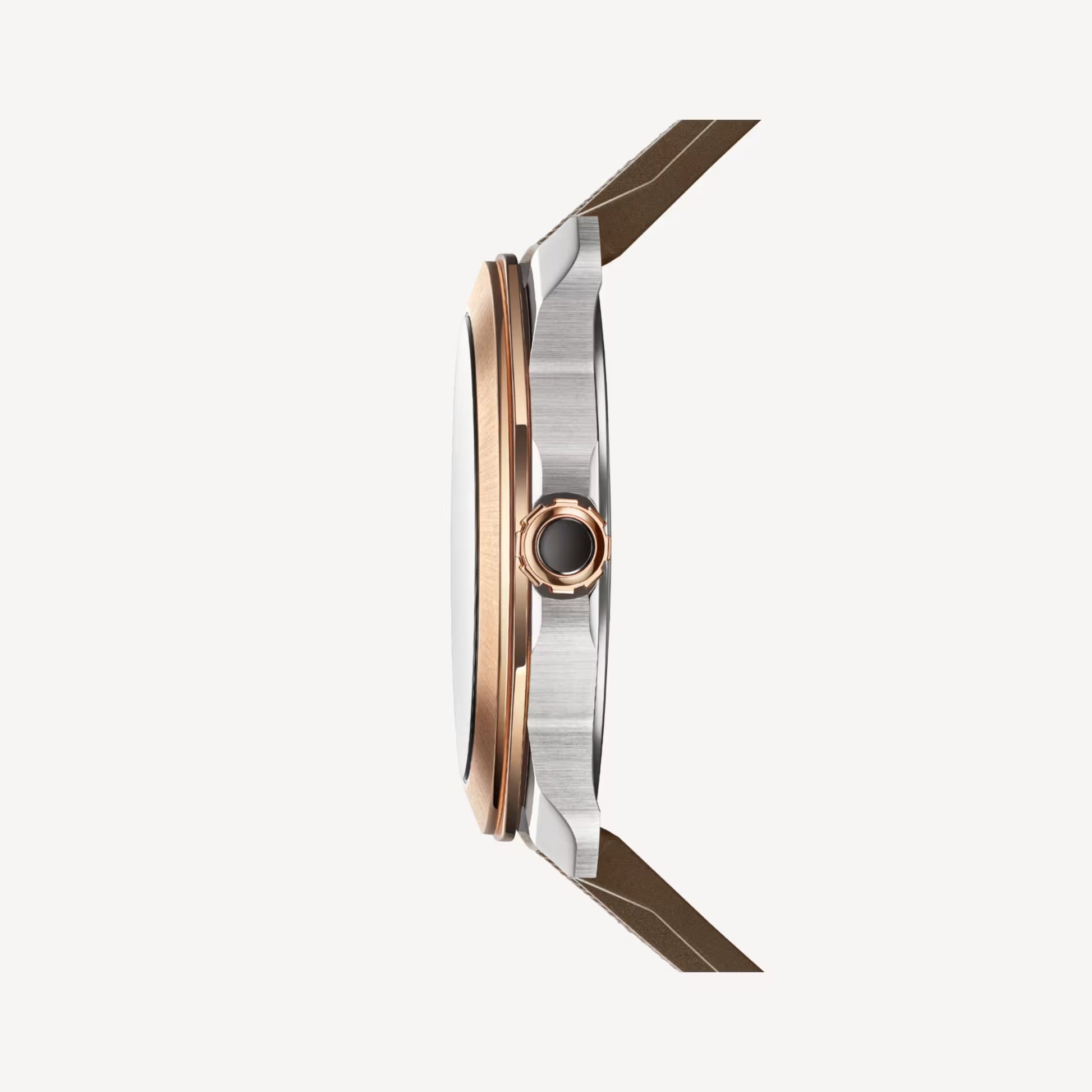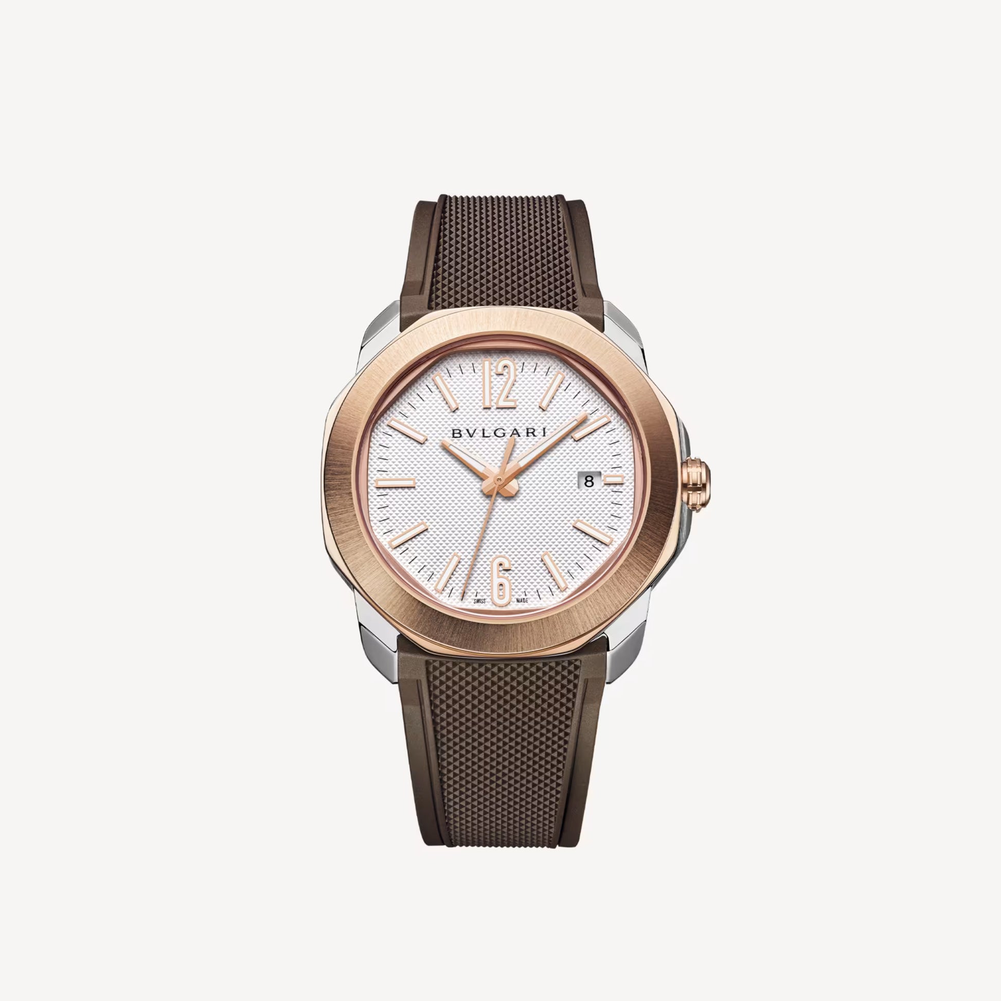 The Bvlgari Octo Roma Special Edition Ref. 103928 captures the essence of modern luxury, combining Roman architectural inspiration with Swiss mechanical mastery and Italian aesthetic finesse. Its iconic round-but-not-round octagonal case in satin-brushed and polished stainless steel, paired with an 18 kt rose gold bezel, delivers a striking contrast of strength and refinement. The grey Clous de Paris dial offers a sophisticated texture enhanced by Super-LumiNova®-filled hands and indexes for optimal legibility, while the BVL 191 automatic calibre ensures precision with a 42-hour power reserve. Completed with an interchangeable stainless steel bracelet and an additional brown rubber strap, this timepiece transitions seamlessly between elegance and sportiness — a symbol of Bvlgari’s timeless creativity and horological excellence.