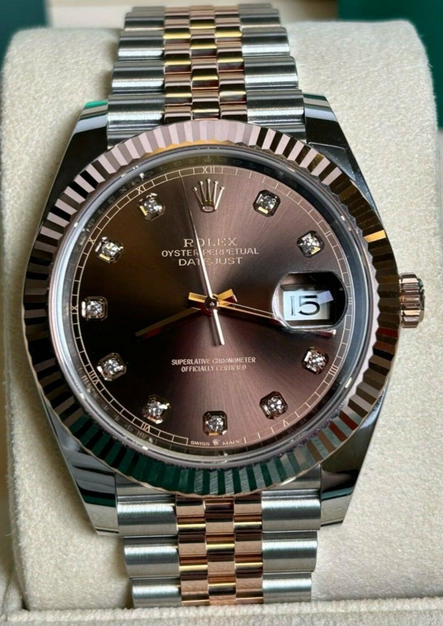 This Oyster Perpetual Datejust 41 in Oystersteel and Everose gold features a chocolate, diamond-set dial and a Jubilee bracelet.