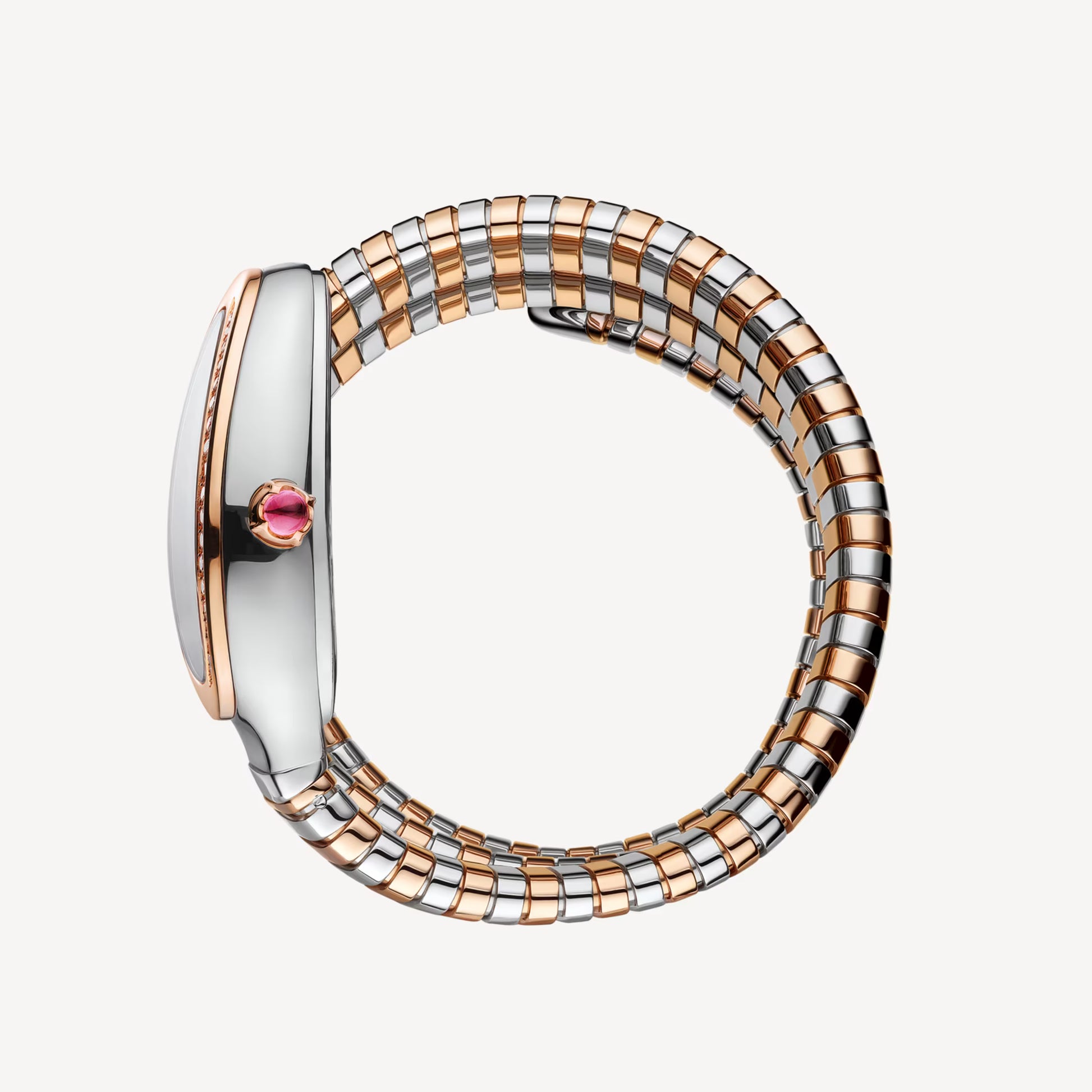 The Bvlgari Serpenti Tubogas Ref. 102791 is a 35mm Swiss-made women’s watch that embodies the sensuality, sophistication, and daring spirit of Bvlgari design. Crafted in 18 kt rose gold and stainless steel, this double-spiral creation masterfully intertwines the serpentine allure of Serpenti with the architectural elegance of the Tubogas technique. The drop-shaped stainless steel case is crowned with an 18kt rose gold bezel set with round brilliant-cut diamonds, framing a green lacquered soleil dial enhanced with a guilloché finish that captures and reflects light with hypnotic depth. A cabochon-cut rubellite adorns the rose gold crown, adding a vivid touch of warmth and sophistication. The supple double-spiral Tubogas bracelet, crafted in alternating rose gold and stainless steel, coils gracefully around the wrist, symbolizing eternal elegance and the sensual movement of the serpent.
