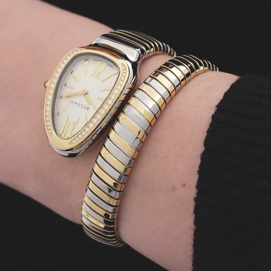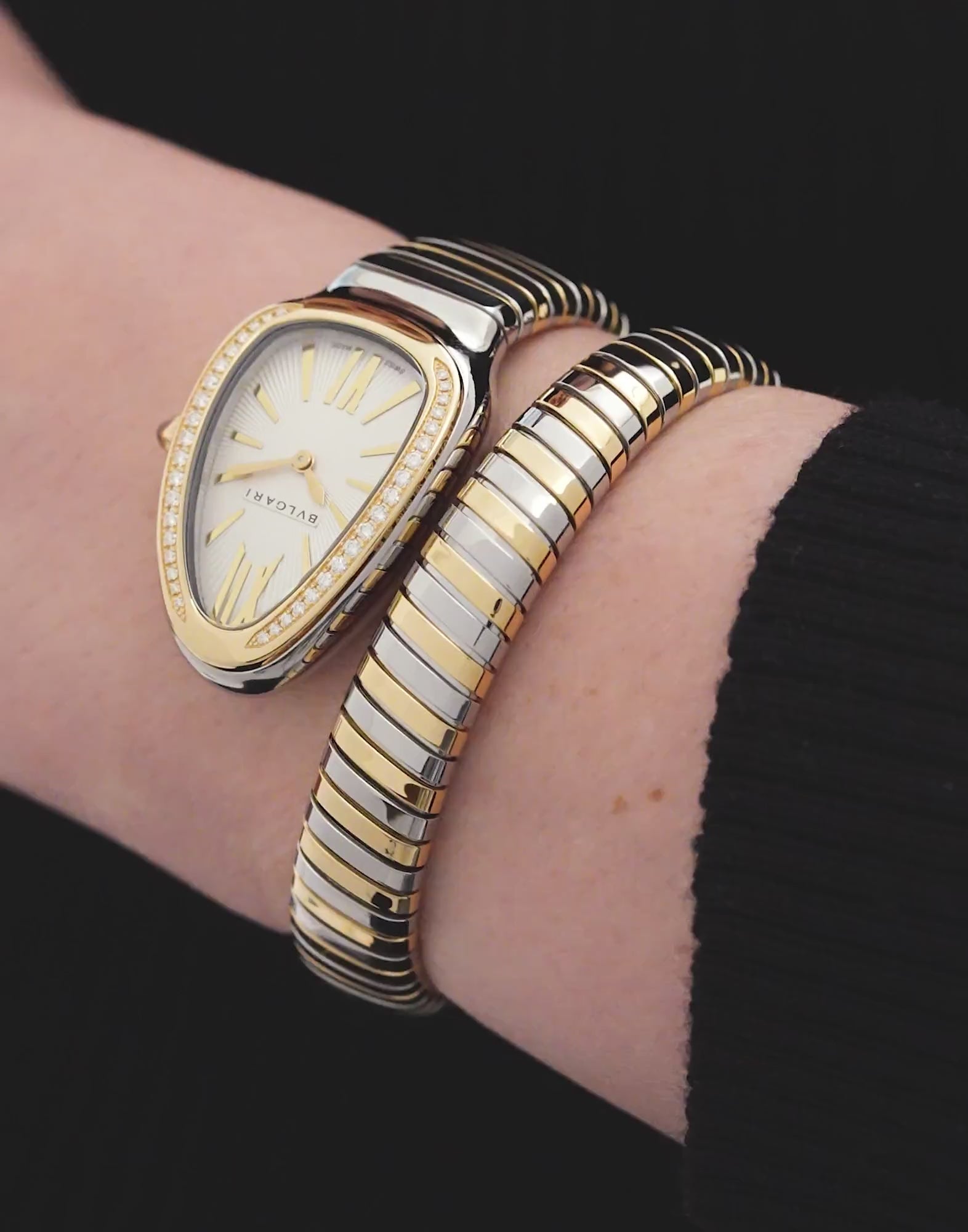 The Bvlgari Serpenti Tubogas Ref. 103648 is a 35mm Swiss-made women’s watch that radiates timeless sophistication, blending 18 kt yellow gold and stainless steel with Bvlgari’s unmistakable artistry. This single-spiral masterpiece unites two legendary design icons, the sensual serpent and the architectural Tubogas, into a seamless expression of glamour and craftsmanship. The curved drop-shaped case, crafted in stainless steel, is crowned with an 18kt yellow gold bezel set with 38 round brilliant-cut diamonds, casting a luminous brilliance against the white opaline dial adorned with a guilloché soleil finish. A cabochon-cut pink rubellite graces the yellow gold crown, adding a vibrant and elegant accent. The flexible single-spiral Tubogas bracelet, in yellow gold and stainless steel, wraps gracefully around the wrist, embodying both strength and sensuality.
