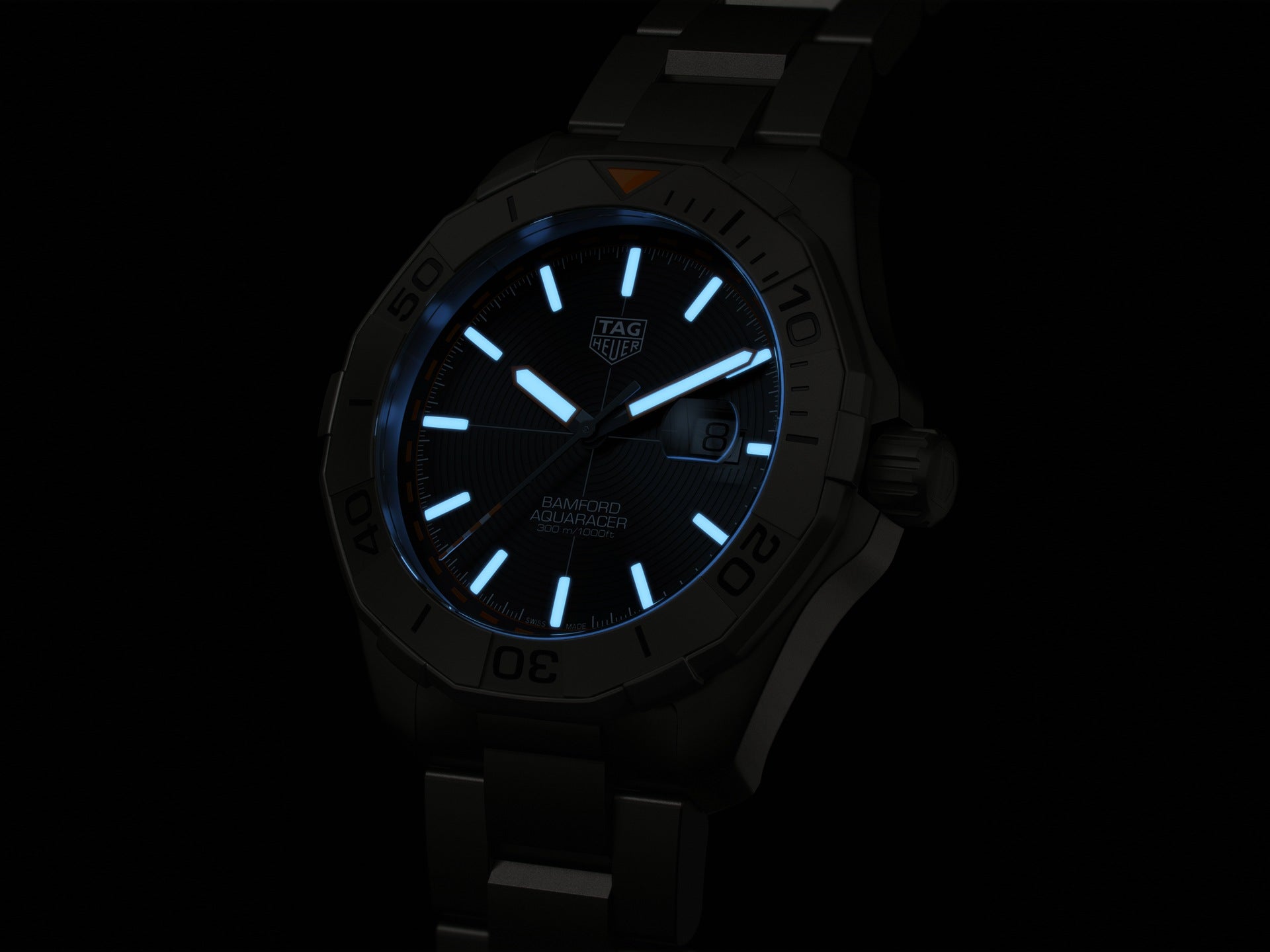 The Tag Heuer Aquaracer Bamford WAY208F.BF0638 is a bold collaboration with the Bamford Watch Department, blending Swiss precision with distinctive British design. Crafted from ultra-light grade 2 titanium, it features a sand-blasted case, a titanium bezel, and a robust 3-row bracelet. The black dial, signed by Bamford at 6 o’clock, contrasts with striking black-gold and orange hands treated with Super-LumiNova® for superior legibility. Powered by the Calibre 5 automatic movement with a 38-hour power reserve, this limited-edition dive watch delivers professional performance with 300-meter water resistance and exclusivity with its engraved case back.