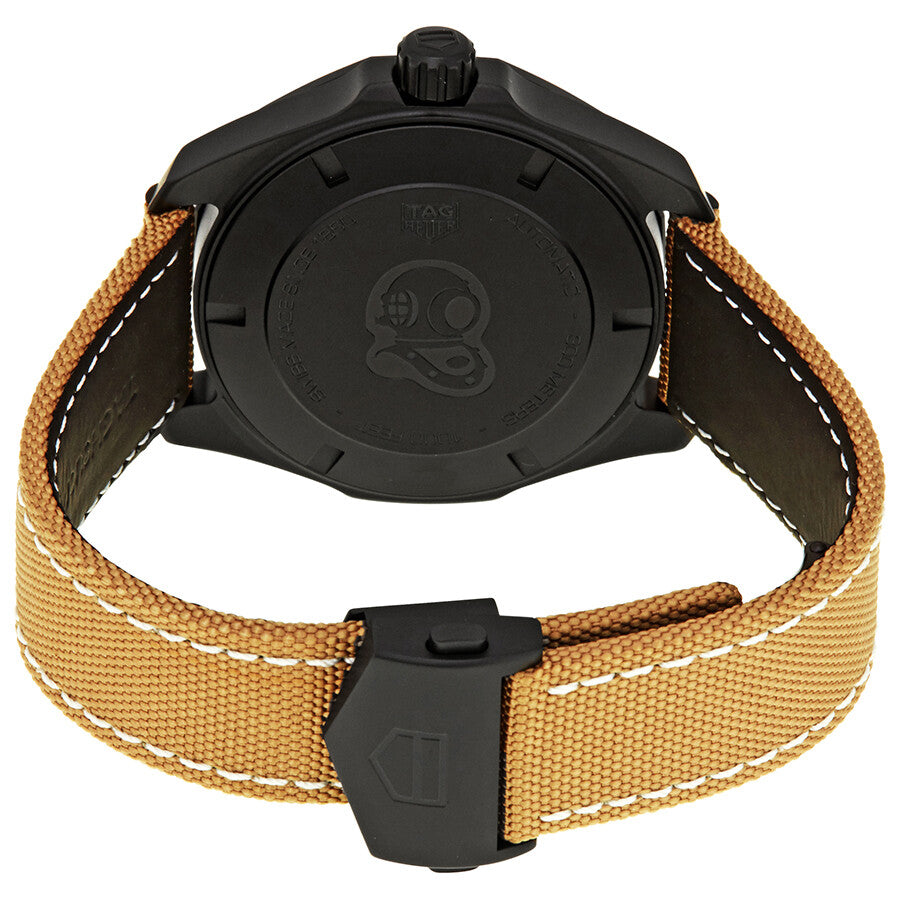 The Tag Heuer Aquaracer Automatic Black Dial Men’s Watch (Model WAY208C.FC6383) is a luxury dive watch crafted with durability and precision in mind. Housed in a black titanium carbide dodecagon case, it features a black dial with sand-tone luminous hands and markers for bold legibility. Powered by the Calibre 5 automatic movement with a 38-hour power reserve, this Swiss-made timepiece offers strength, style, and performance. Paired with a rugged sand nylon strap and water resistance up to 300 meters, it is built for both adventure and elegance.