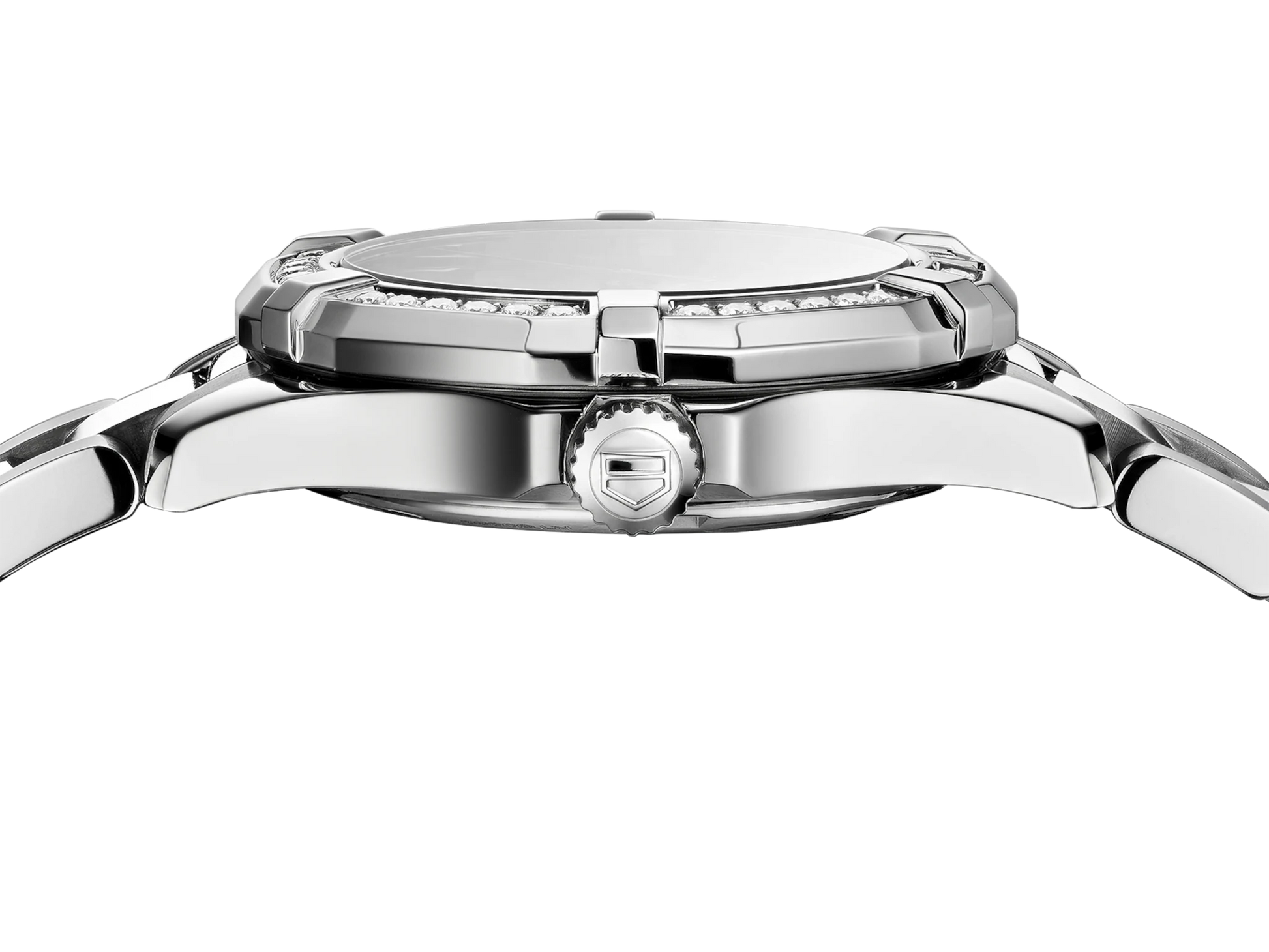 The TAG Heuer Aquaracer Ladies Watch WAY131P.BA0748 is a luxurious Swiss-made timepiece that perfectly balances sophistication with durability. Its 35mm stainless steel dodecagon-shaped case is paired with a unidirectional bezel set with 35 dazzling diamonds (0.61 ct). Powered by a reliable quartz movement and water resistant up to 300 metres, this watch is designed to shine whether worn as a dress piece or in active environments.