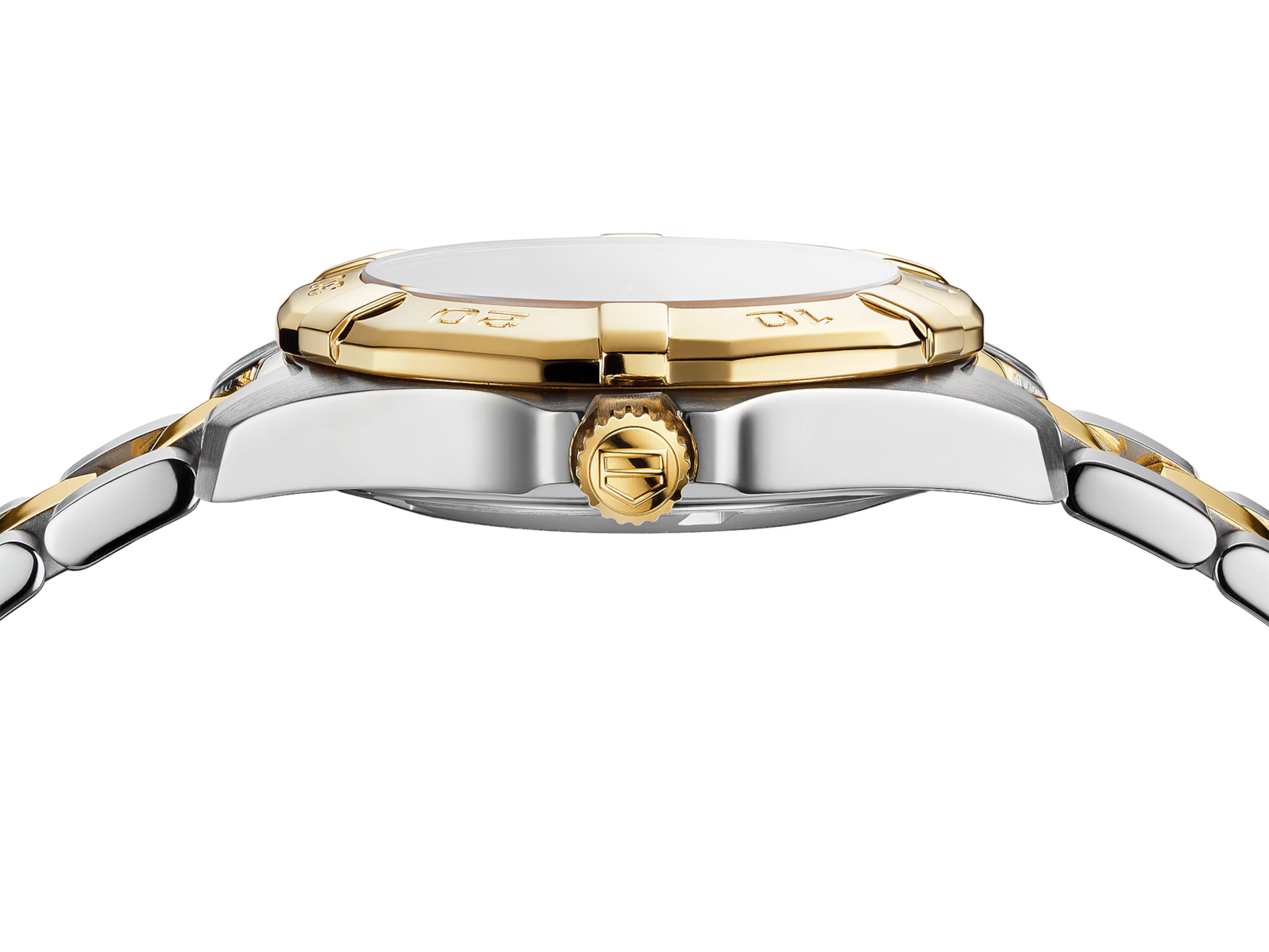 The TAG Heuer Aquaracer WBD1322.BB0320 is a refined Swiss-made ladies’ watch that blends sporting heritage with timeless luxury. Housed in a 32mm stainless steel case with 18K 2N yellow gold plating and a matching gold-plated bezel, this timepiece exudes sophistication. Its ethereal white mother-of-pearl dial is adorned with 11 diamond hour markers, adding a luminous sparkle to its elegant design. Protected by scratch-resistant sapphire crystal and water resistant up to 300 metres, it is powered by a precise quartz movement that ensures accuracy and reliability. A stainless steel and gold-plated bracelet completes the look, making this Aquaracer the perfect fusion of elegance and performance.