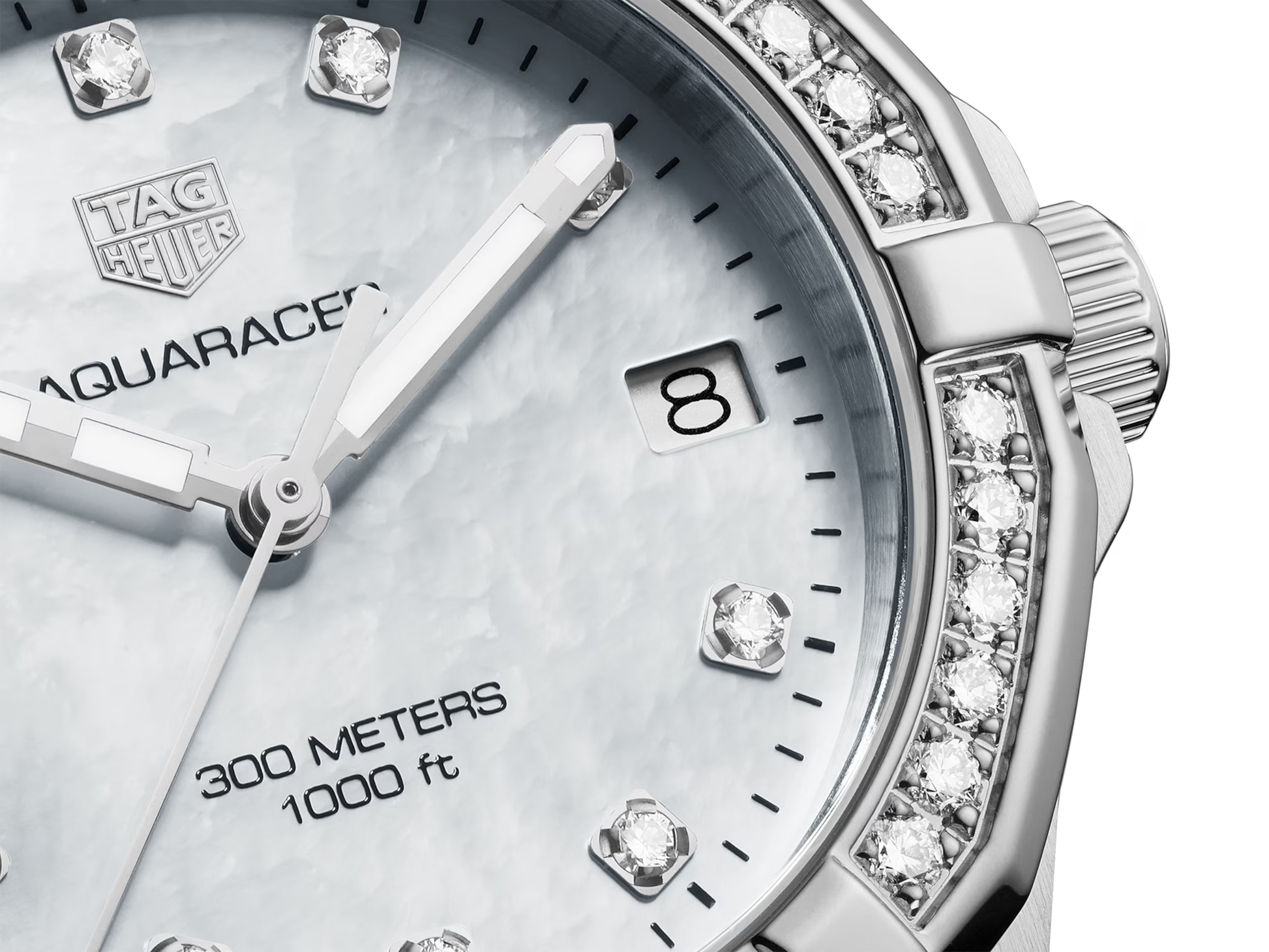 The TAG Heuer Aquaracer WBD1315.BA0740 is a 32mm Swiss-made ladies’ watch featuring a diamond-set unidirectional bezel, white mother-of-pearl dial with luminous hands, and a stainless steel bracelet. Powered by quartz movement, it is water-resistant up to 300 metres.