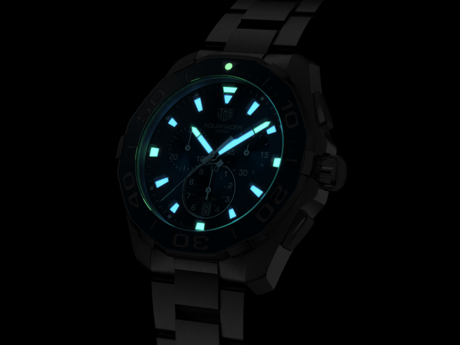 The TAG Heuer Aquaracer 43mm CAY111B.BA0927 Quartz Chronograph carries forward the brand’s long-standing heritage in watersports, dating back to 1895 when Heuer patented its first water-resistant case. Built for rugged endurance and precision, this timepiece combines professional diving features with a bold, sporty aesthetic.