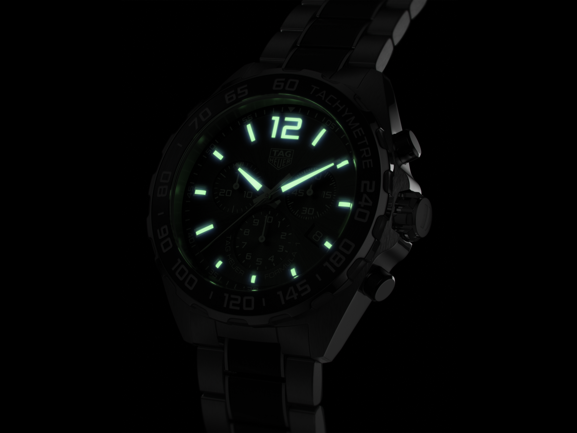 • Dial: Black dial with luminous baton markers, chronograph sub-dials, and date window.