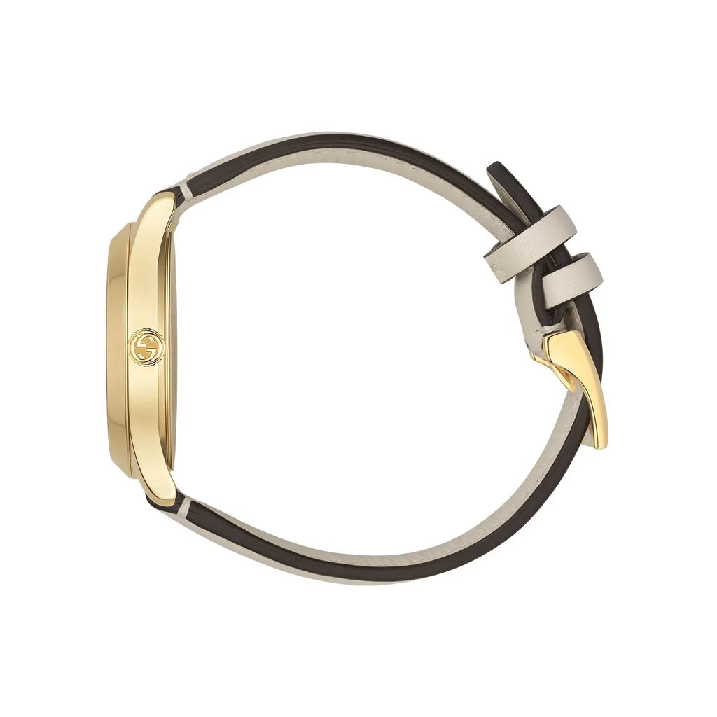 Stylish and versatile, the Gucci YA1264128 features a 38mm yellow gold PVD case, green and red web nylon dial, and white leather strap. Swiss-made quartz movement ensures reliable timekeeping, perfect for everyday wear.