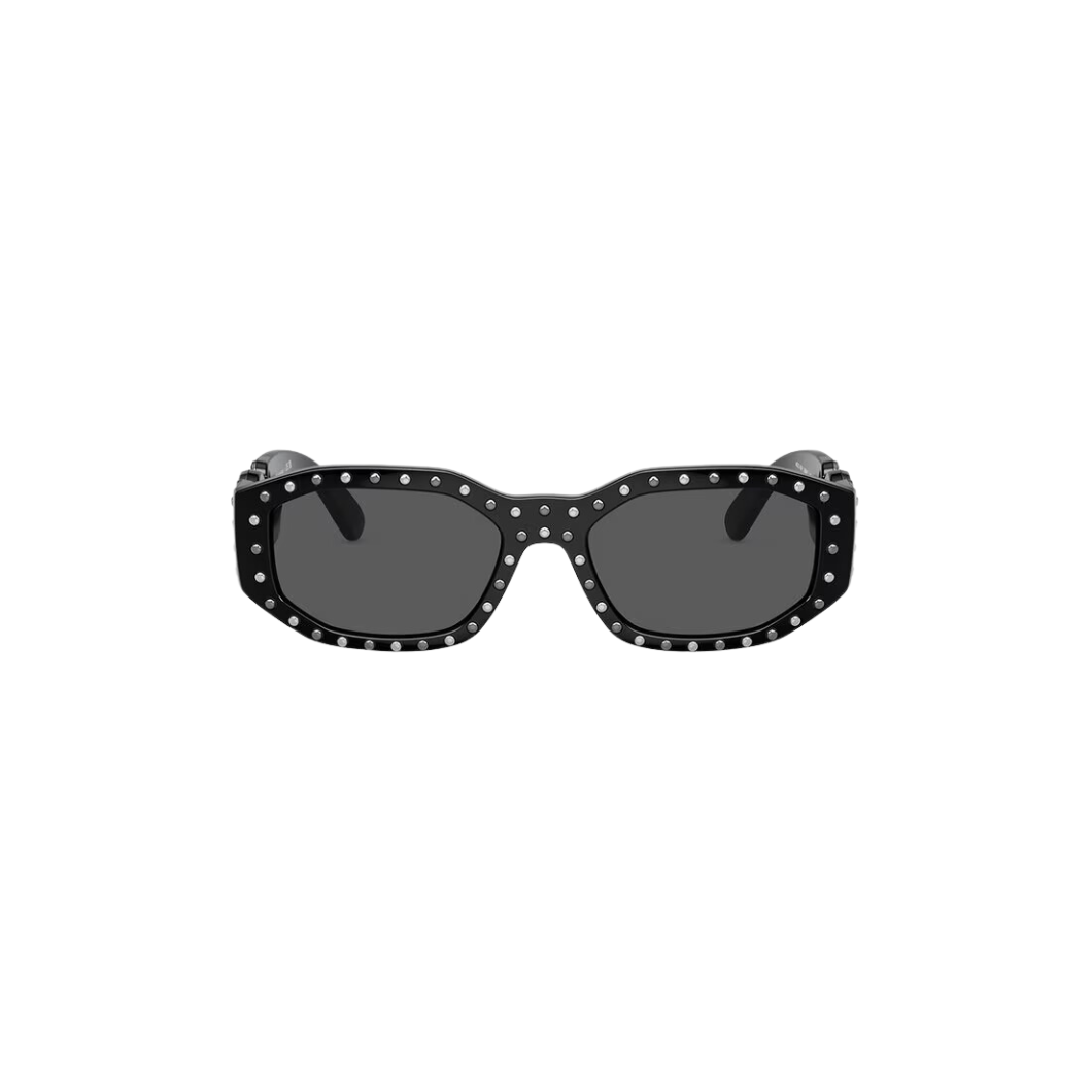 Introducing the Studded Medusa Biggie Sunglasses, a bold and luxurious accessory that exudes Versace's signature style. These rectangular frames are crafted from high-quality injected material, ensuring durability and comfort. The striking black frame, temple, and lenses create a sleek, monochromatic look. The standout feature is the iconic Medusa Biggie emblem at the temples, enhanced with stud embellishments that add a touch of edgy sophistication. Perfect for making a fashion statement, these sunglasses combine elegance with a modern twist, embodying the opulence and daring style of Versace.