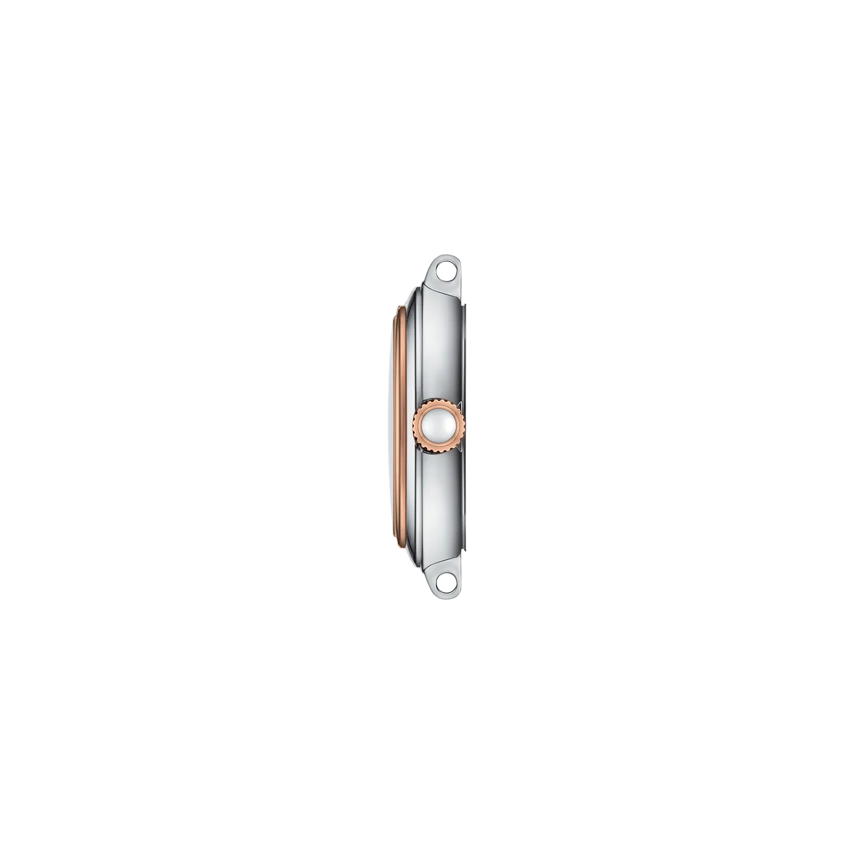 The Tissot Bellissima Small Lady 26mm (T126.010.22.013.01) combines timeless elegance with luxurious details for a watch that transitions effortlessly from day to night. Its 26 mm 316L stainless steel case with rose gold PVD coating is paired with a five-link bracelet and domed scratch-resistant sapphire crystal with antireflective coating. The silver Roman numeral dial features a delicate rose-shaped guilloché pattern, while the crown is adorned with a white ceramic cabochon for a sparkling finish. Powered by precise Swiss quartz movement, this watch is perfect for celebrating style and sophistication every day.
